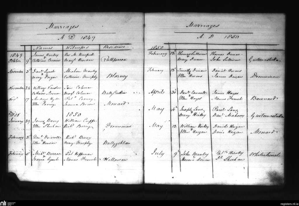 Blarney; County of Cork; Diocese of Cloyne. Marriages, Oct. 1849 to July 1850