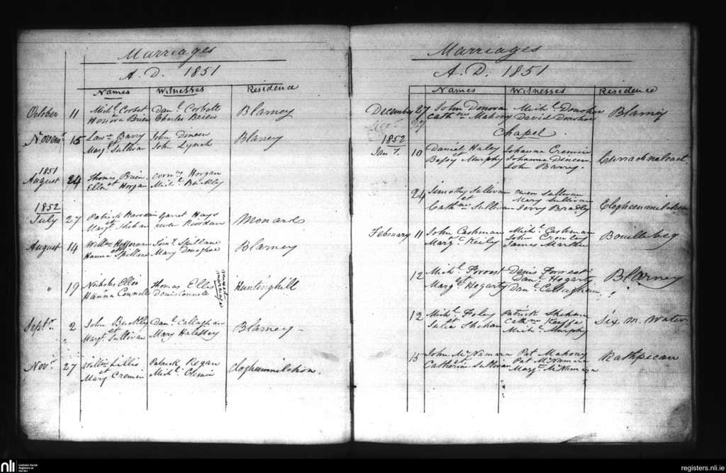 Blarney; County of Cork; Diocese of Cloyne. Marriages, Aug. 1851 to Dec. 1852