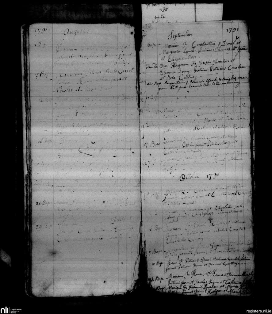 Collon; County of Meath, Louth; Archdiocese of Armagh. Baptisms, Aug. 1791 to Oct. 1791