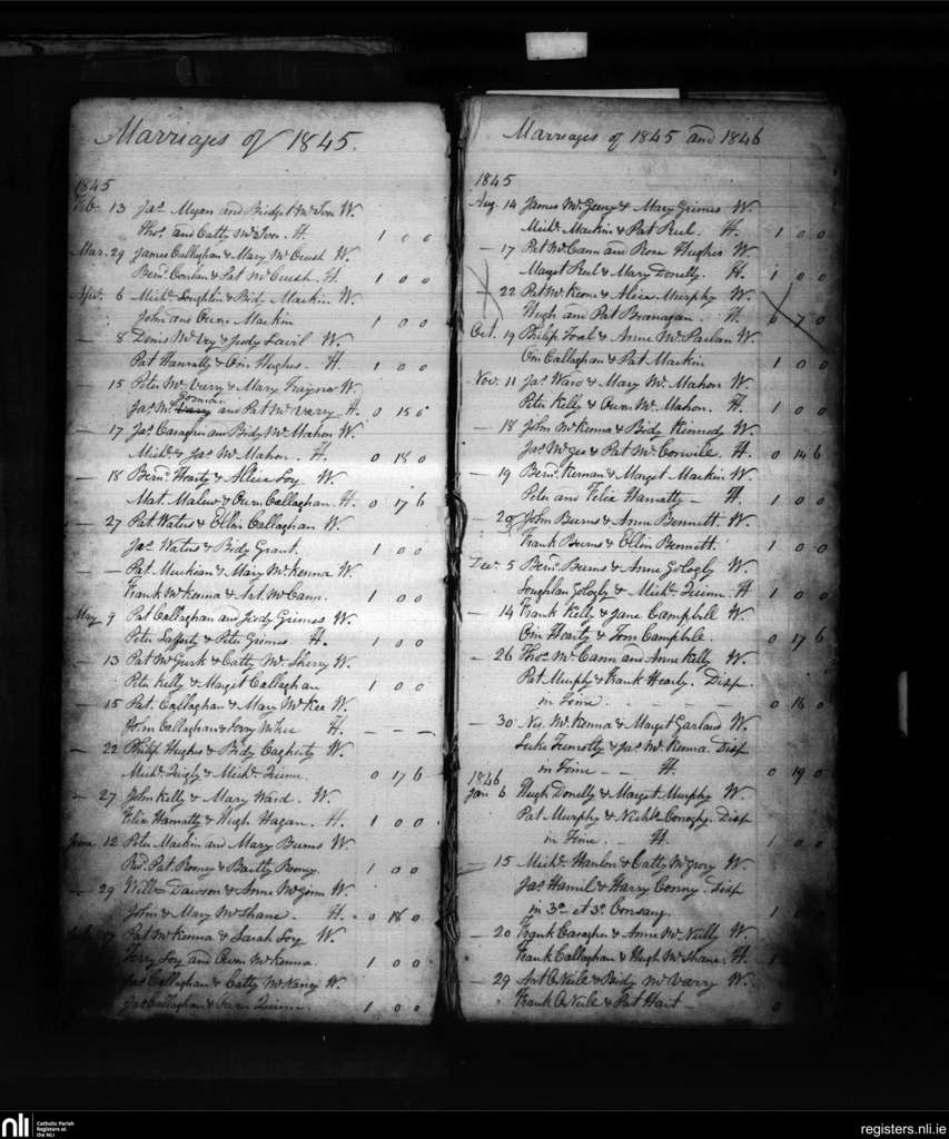 Creggan Lower; County of Armagh; Archdiocese of Armagh. Marriages, Feb. 1845 to Jan. 1846