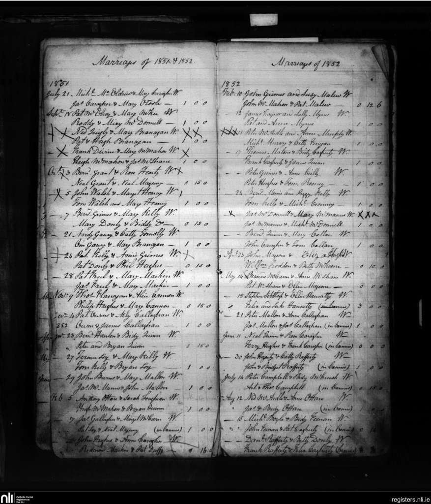 Creggan Lower; County of Armagh; Archdiocese of Armagh. Marriages, July 1851 to Aug. 1852
