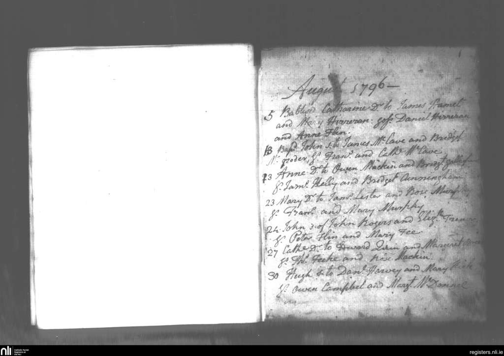 Creggan Upper; County of Armagh, Louth; Archdiocese of Armagh. Baptisms, Aug. 1796