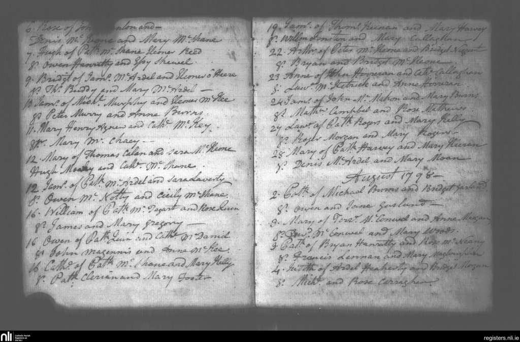 Creggan Upper; County of Armagh, Louth; Archdiocese of Armagh. Baptisms, July 1798 to Aug. 1798