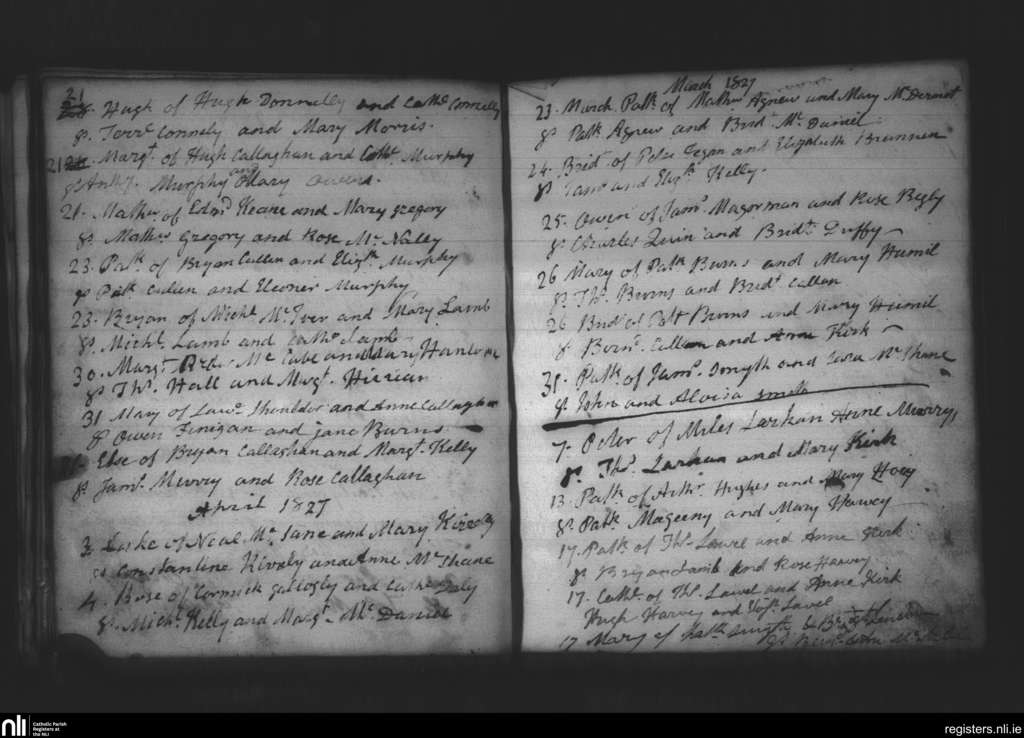 Creggan Upper; County of Armagh, Louth; Archdiocese of Armagh. Baptisms, Mar. 1827 to Apr. 1827