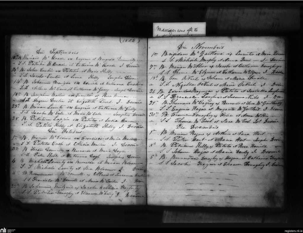 Killeeshil; County of Tyrone; Archdiocese of Armagh. Baptisms, Sep. 1852 to Dec. 1852