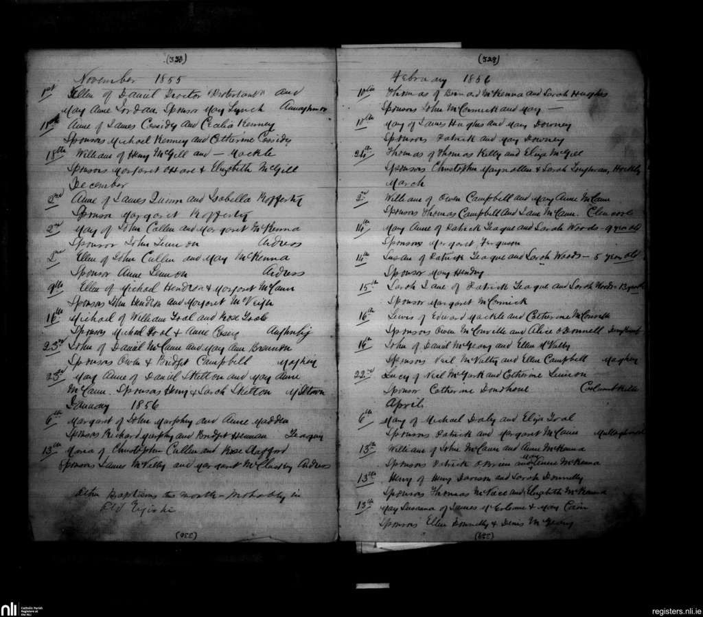 Loughgall and Tartaraghan; County of Armagh; Archdiocese of Armagh. Baptisms, Nov. 1855 to Apr. 1856