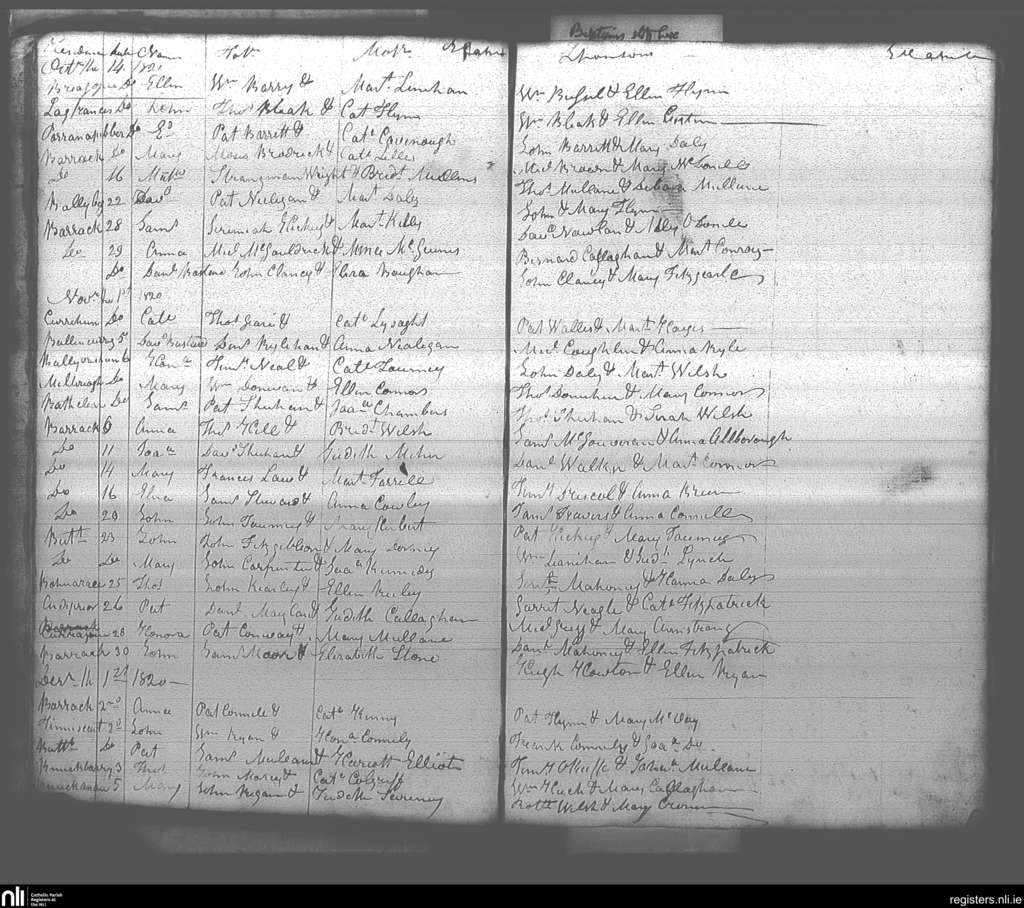 Buttevant; County of Cork; Diocese of Cloyne. Baptisms, Oct. 1820 to Dec. 1820
