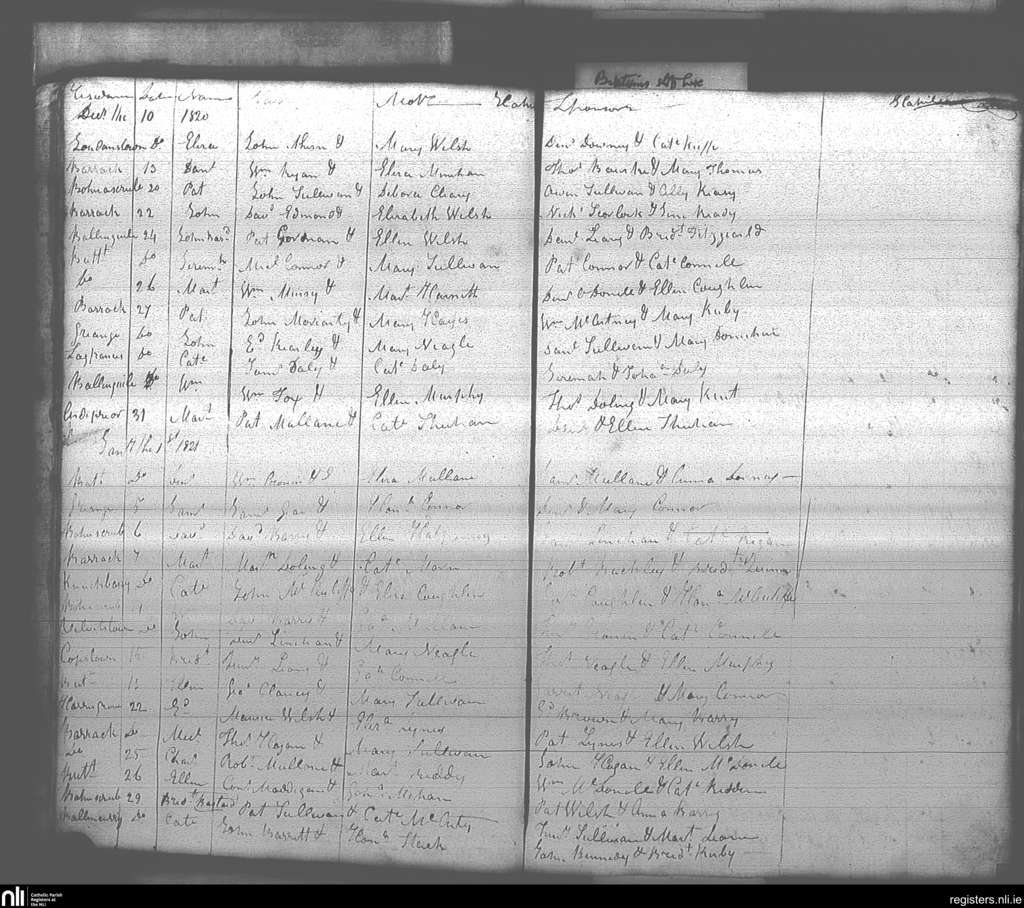 Buttevant; County of Cork; Diocese of Cloyne. Baptisms, Dec. 1820 to Jan. 1821