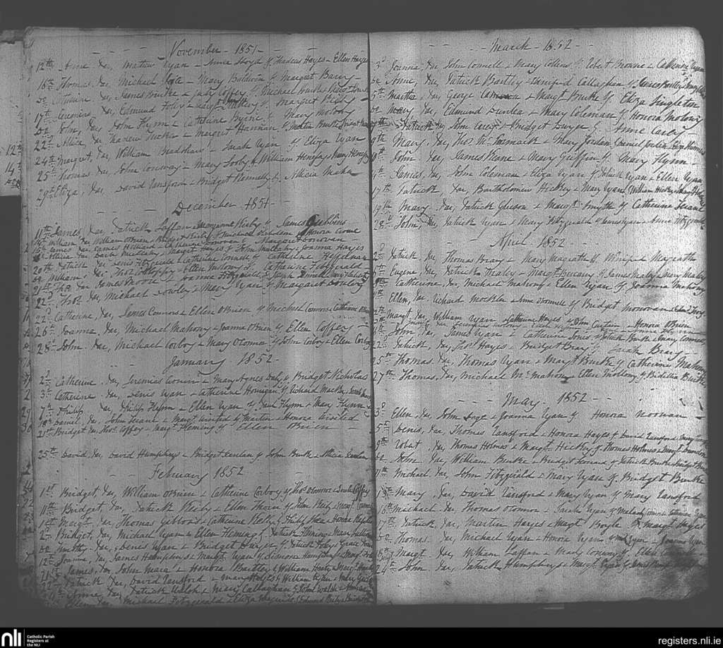 Murroe, Boher and Abington; County of Tipperary, Limerick; Diocese of Cashel and Emly. Baptisms, Nov. 1851 to May 1852