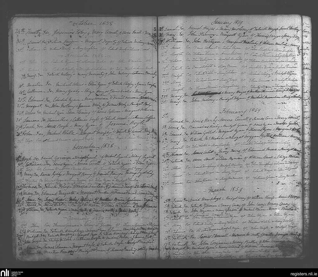Murroe, Boher and Abington; County of Tipperary, Limerick; Diocese of Cashel and Emly. Baptisms, Oct. 1858 to Mar. 1859