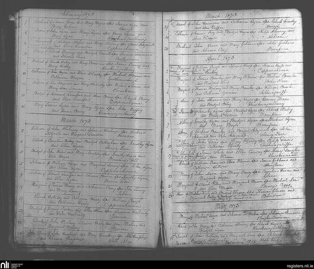 Murroe, Boher and Abington; County of Tipperary, Limerick; Diocese of Cashel and Emly. Baptisms, Feb. 1873 to May 1873