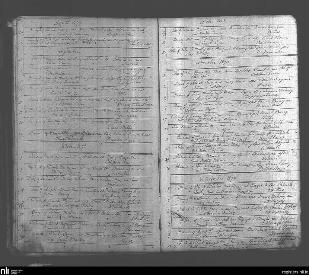 Murroe, Boher and Abington; County of Tipperary, Limerick; Diocese of Cashel and Emly. Baptisms, Aug. 1873 to Dec. 1873
