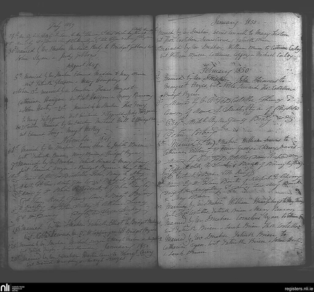 Murroe, Boher and Abington; County of Tipperary, Limerick; Diocese of Cashel and Emly. Marriages, July 1849 to Feb. 1850