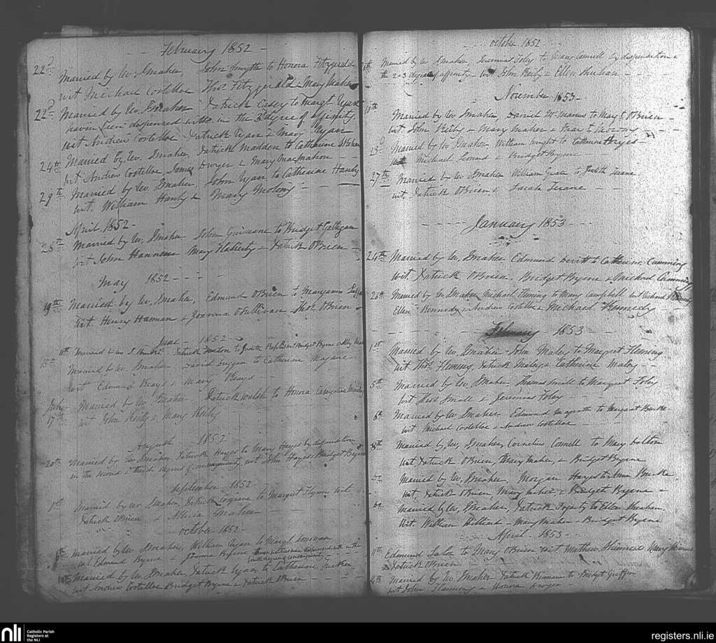 Murroe, Boher and Abington; County of Tipperary, Limerick; Diocese of Cashel and Emly. Marriages, Feb. 1852 to Nov. 1853
