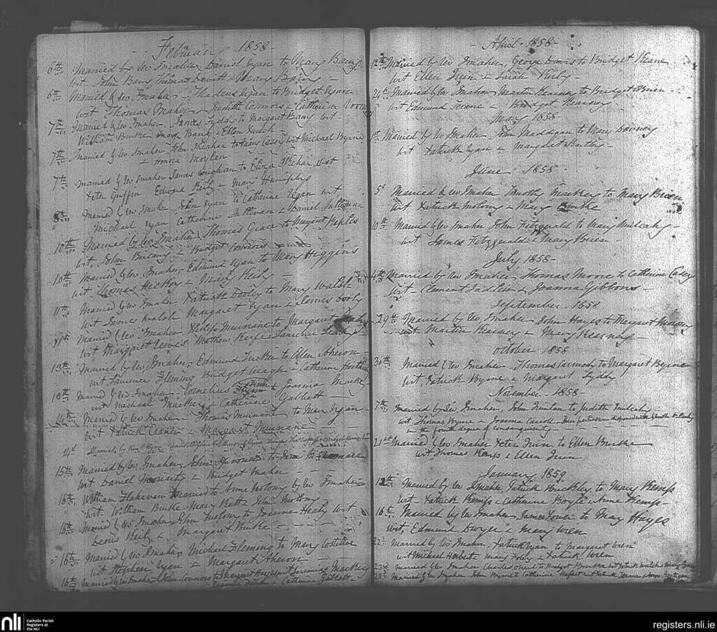 Murroe, Boher and Abington; County of Tipperary, Limerick; Diocese of Cashel and Emly. Marriages, Feb. 1858 to Jan. 1859