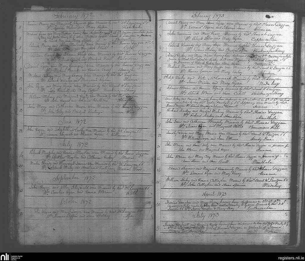 Murroe, Boher and Abington; County of Tipperary, Limerick; Diocese of Cashel and Emly. Marriages, Feb. 1872 to July 1873