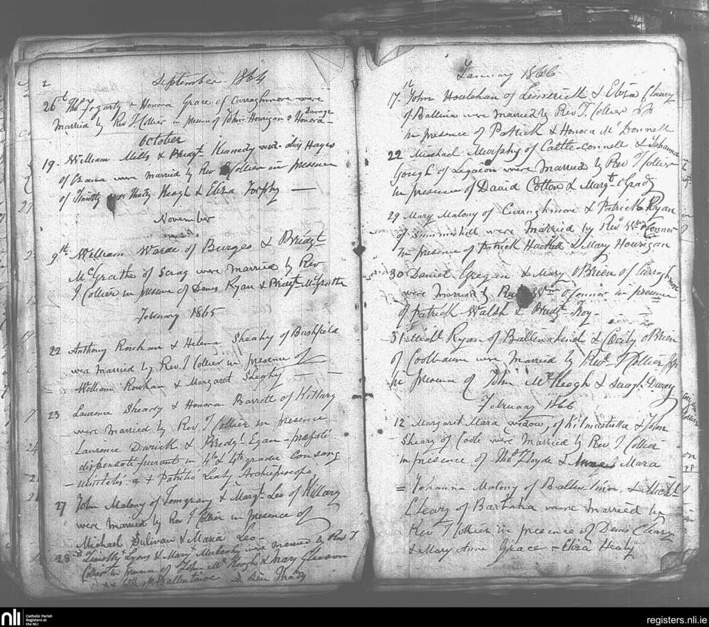 Ballina; County of Tipperary; Diocese of Cashel and Emly. Marriages, Sep. 1864 to Feb. 1866