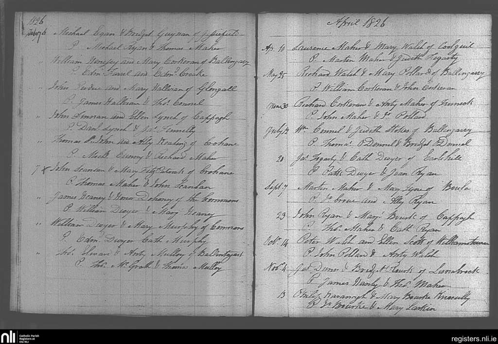 Ballingarry; County of Tipperary; Diocese of Cashel and Emly. Marriages, Feb. 1826 to Nov. 1826