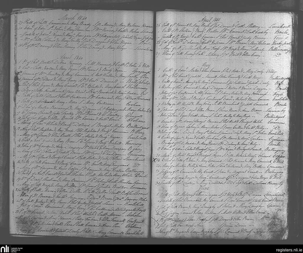 Ballingarry; County of Tipperary; Diocese of Cashel and Emly. Baptisms, Mar. 1840 to June 1840