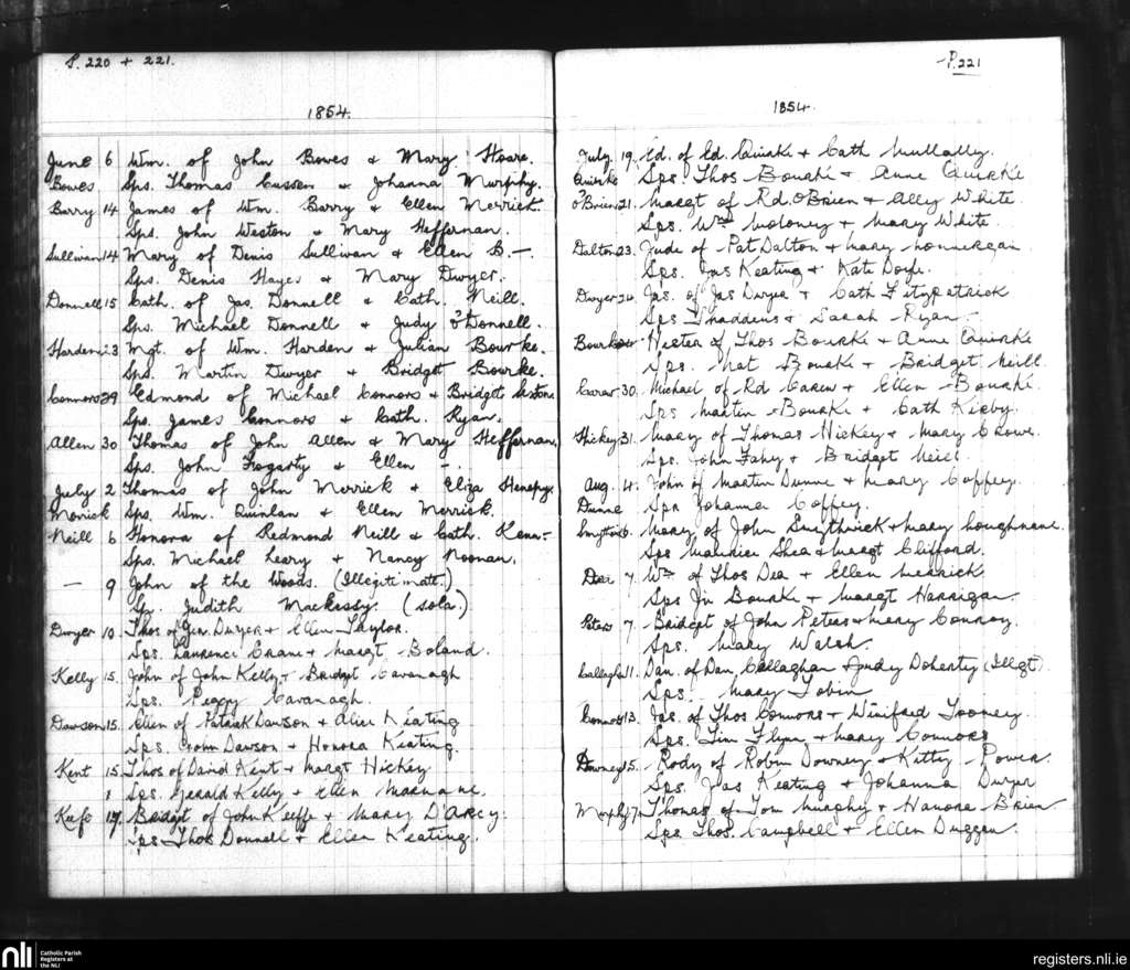 Bansha and Kilmoyler; County of Tipperary; Diocese of Cashel and Emly. Baptisms, June 1854 to Aug. 1854