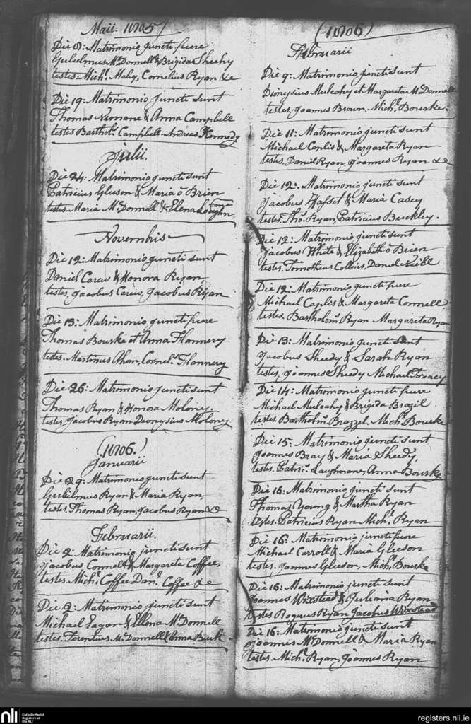 Newport; County of Tipperary; Diocese of Cashel and Emly. Marriages, May 1805 to Feb. 1806