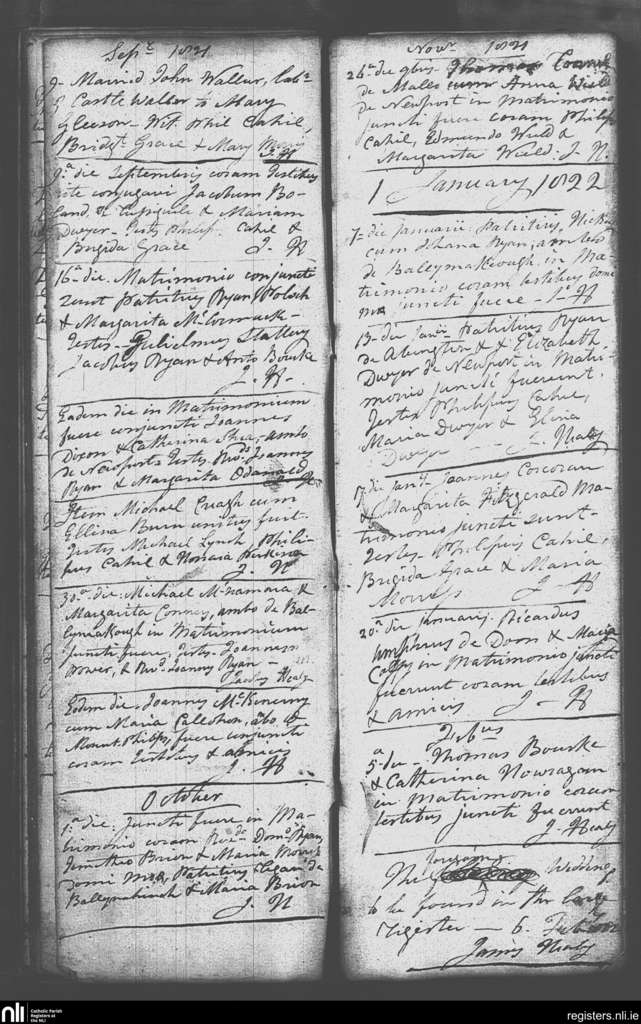 Newport; County of Tipperary; Diocese of Cashel and Emly. Marriages, Sep. 1821 to Feb. 1822