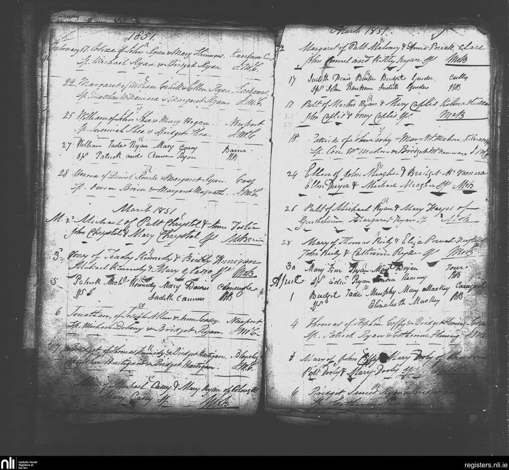 Newport; County of Tipperary; Diocese of Cashel and Emly. Baptisms, Feb. 1851 to Apr. 1851