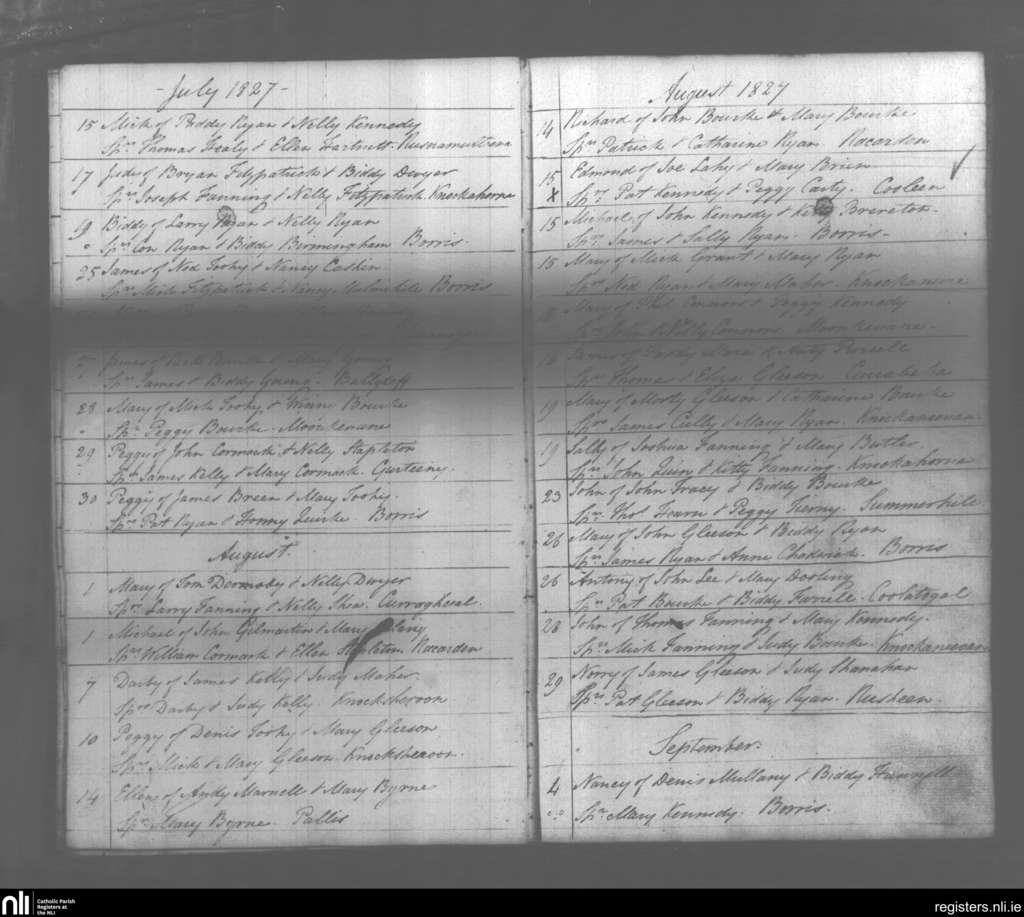 Borrisoleigh; County of Tipperary; Diocese of Cashel and Emly. Baptisms, July 1827 to Sep. 1827