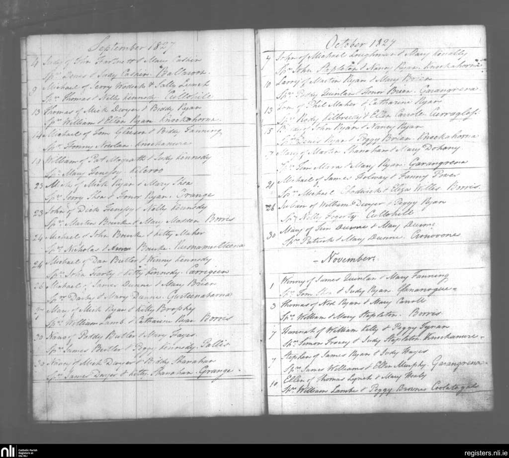 Borrisoleigh; County of Tipperary; Diocese of Cashel and Emly. Baptisms, Sep. 1827 to Nov. 1827