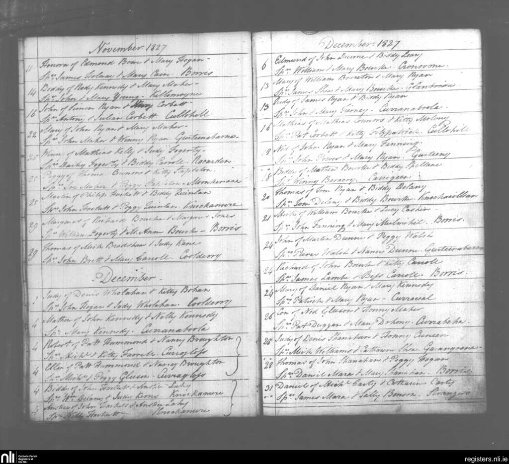 Borrisoleigh; County of Tipperary; Diocese of Cashel and Emly. Baptisms, Nov. 1827 to Dec. 1827