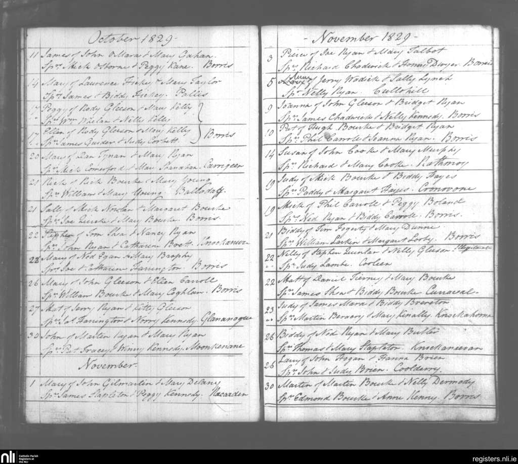Borrisoleigh; Contae Tipperary; Deoise Cashel and Emly. Baptisms, DF 1829 go dtí an Samh. 1829