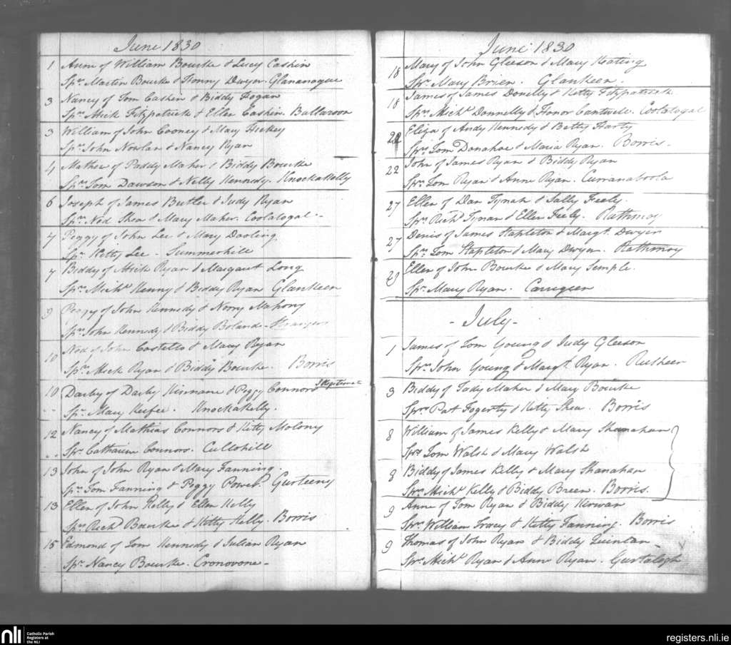 Borrisoleigh; County of Tipperary; Diocese of Cashel and Emly. Baptisms, June 1830 to July 1830
