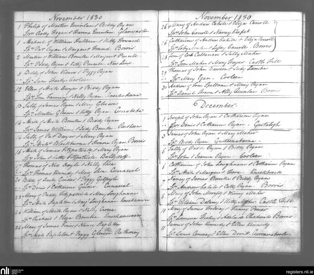 Borrisoleigh; County of Tipperary; Diocese of Cashel and Emly. Baptisms, Nov. 1830 to Dec. 1830