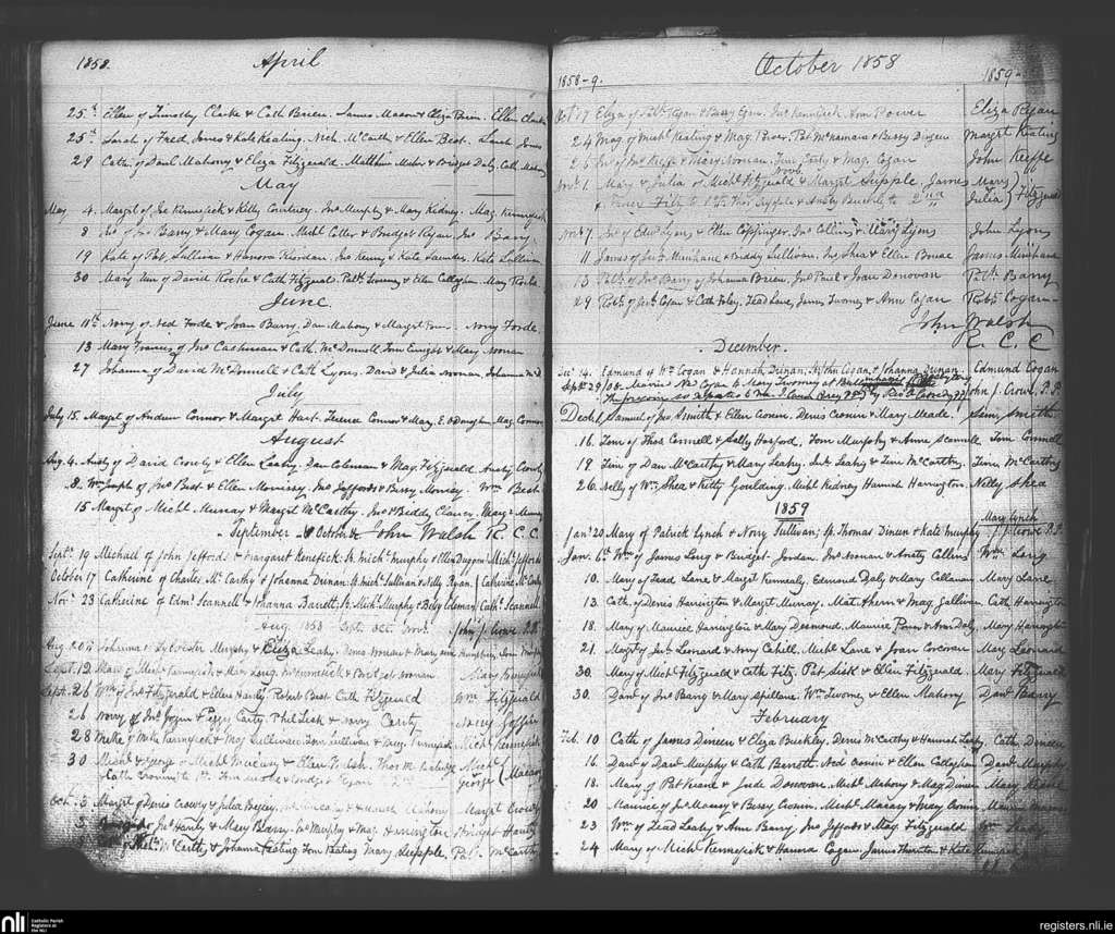 Carrigaline; County of Cork; Diocese of Cork and Ross. Baptisms, Apr. 1858 to Feb. 1859