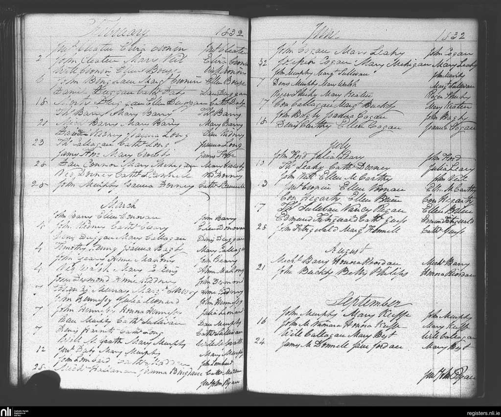 Carrigaline; County of Cork; Diocese of Cork and Ross. Marriages, Feb. 1832 to Sep. 1832