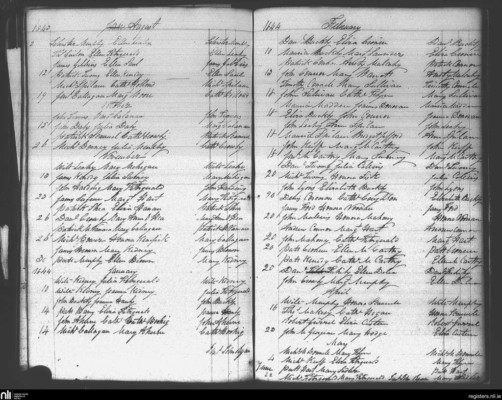 Carrigaline; County of Cork; Diocese of Cork and Ross. Marriages, Aug. 1843 to June 1844