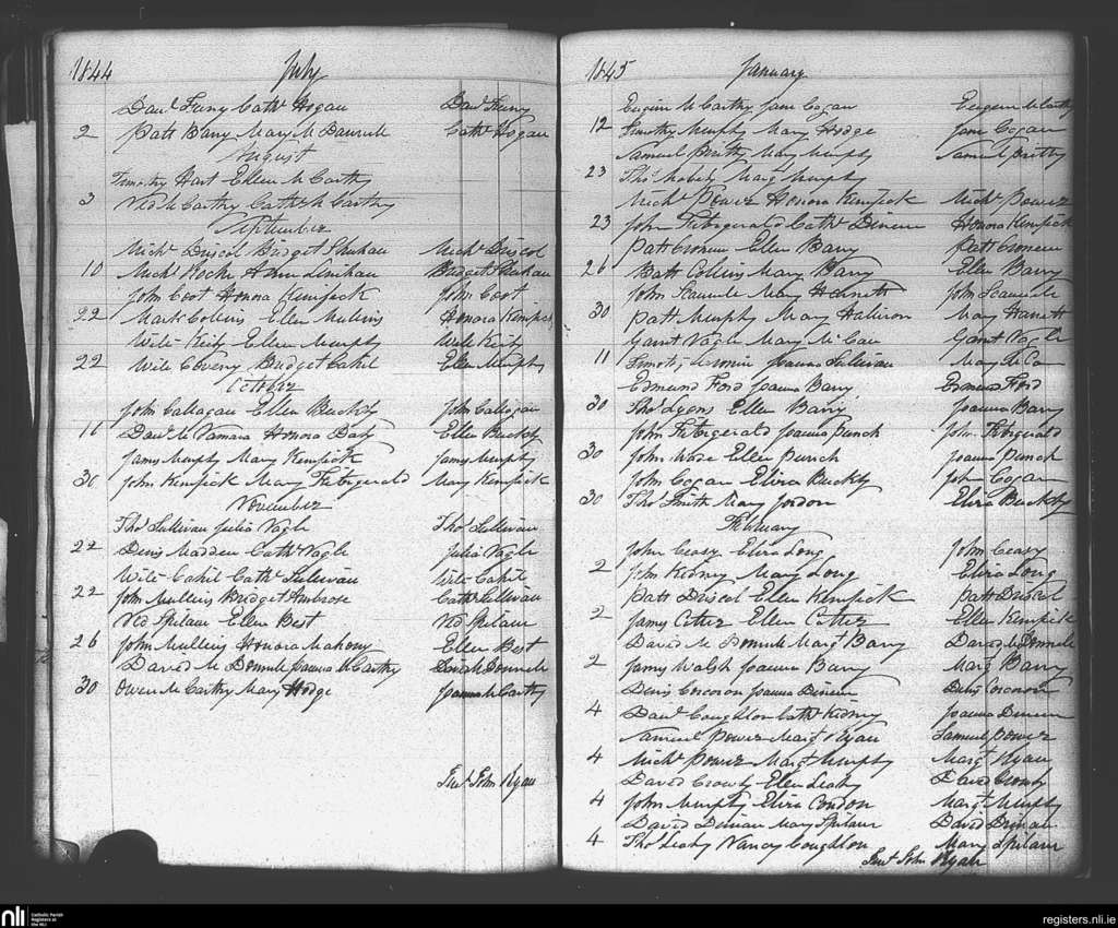 Carrigaline; County of Cork; Diocese of Cork and Ross. Marriages, July 1844 to Feb. 1845