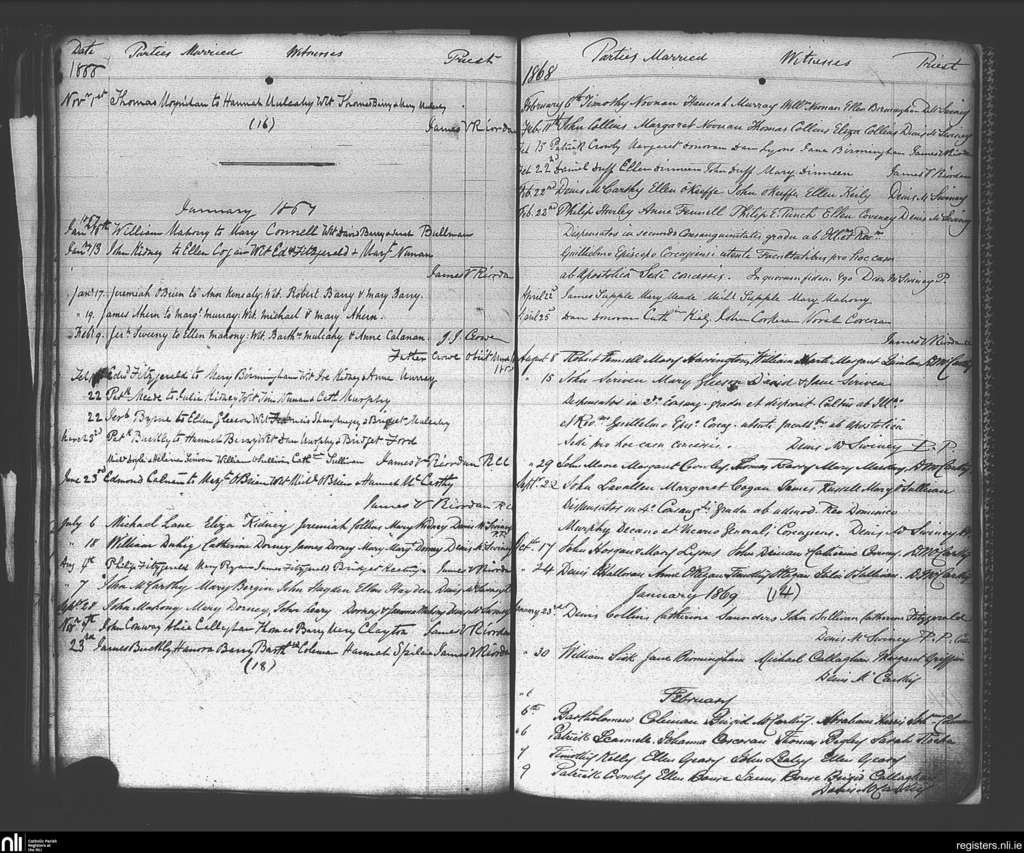 Carrigaline; County of Cork; Diocese of Cork and Ross. Marriages, Nov. 1866 to Feb. 1869