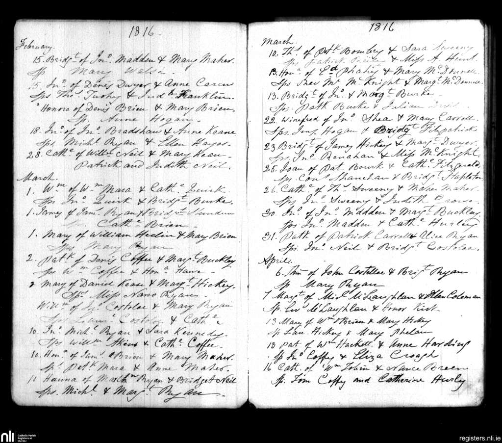 Cappawhite; County of Tipperary; Diocese of Cashel and Emly. Baptisms, Feb. 1816 to Apr. 1816