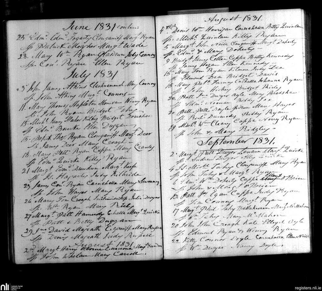 Cappawhite; County of Tipperary; Diocese of Cashel and Emly. Baptisms, June 1831 to Sep. 1831