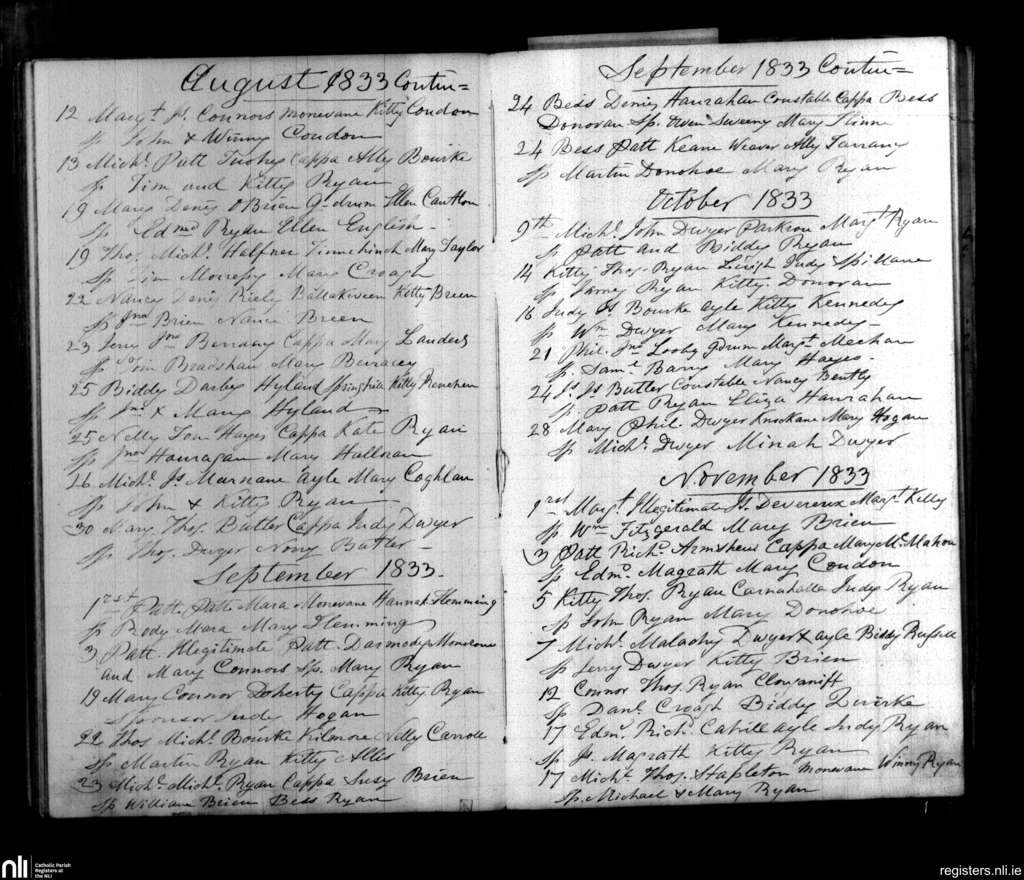 Cappawhite; County of Tipperary; Diocese of Cashel and Emly. Baptisms, Aug. 1833 to Nov. 1833
