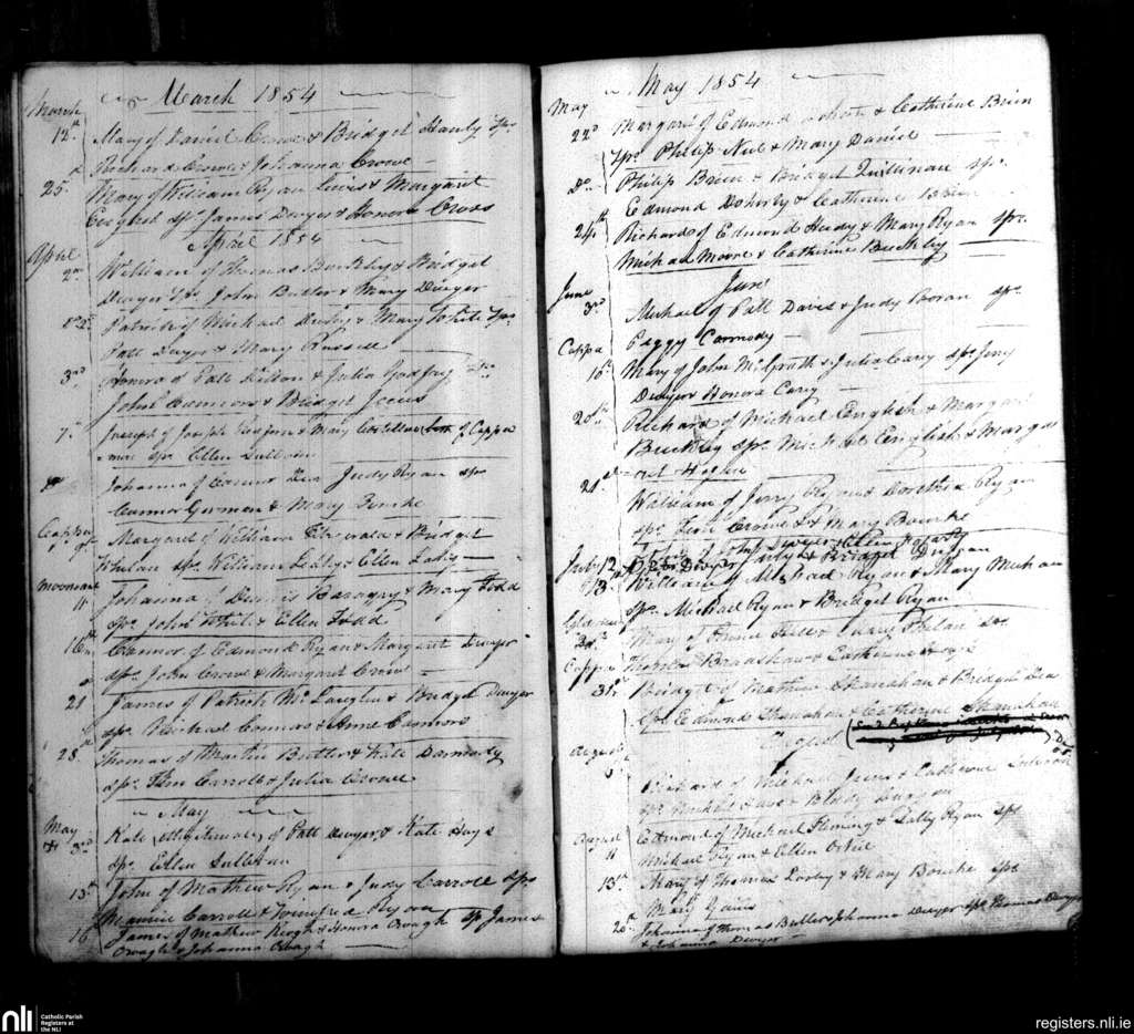 Cappawhite; County of Tipperary; Diocese of Cashel and Emly. Baptisms, Mar. 1854 to Aug. 1854