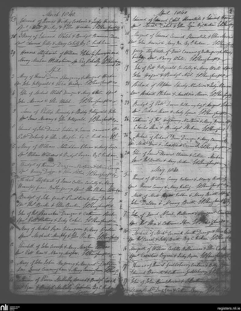 Drangan; County of Tipperary; Diocese of Cashel and Emly. Baptisms, Mar. 1840 to May 1840