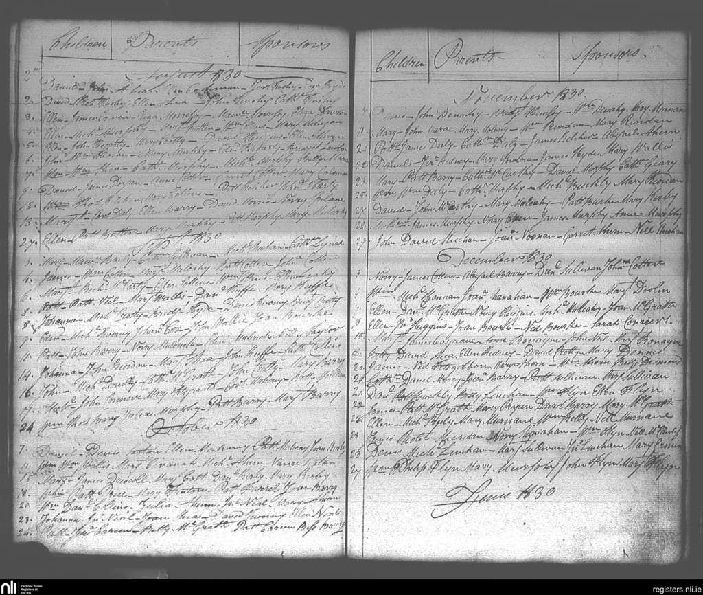 Carrigtohill; County of Cork; Diocese of Cloyne. Baptisms, Aug. 1830 to Dec. 1830