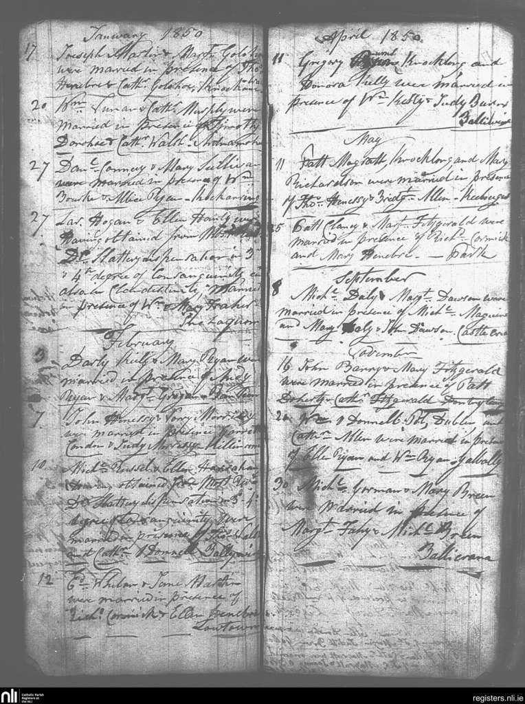 Galbally and Aherlow; County of Limerick, Tipperary; Diocese of Cashel and Emly. Marriages, Jan. 1850 to Nov. 1850