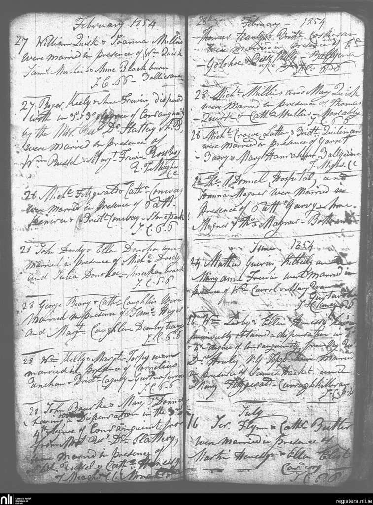 Galbally and Aherlow; County of Limerick, Tipperary; Diocese of Cashel and Emly. Marriages, Feb. 1854 to July 1854