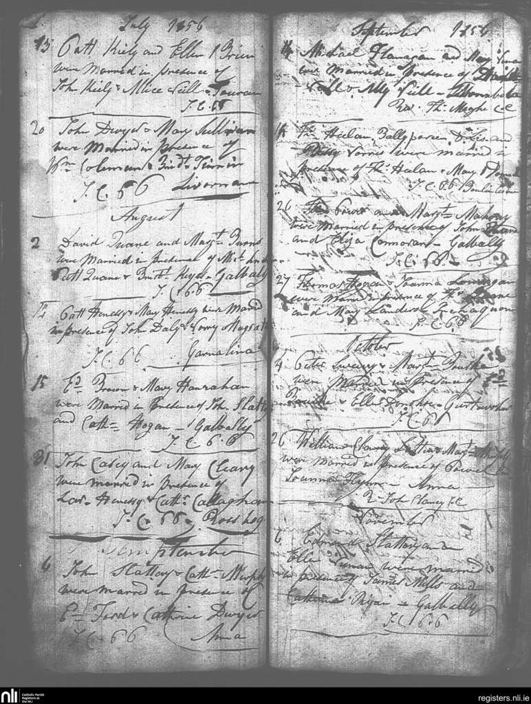 Galbally and Aherlow; County of Limerick, Tipperary; Diocese of Cashel and Emly. Marriages, July 1856 to Nov. 1856