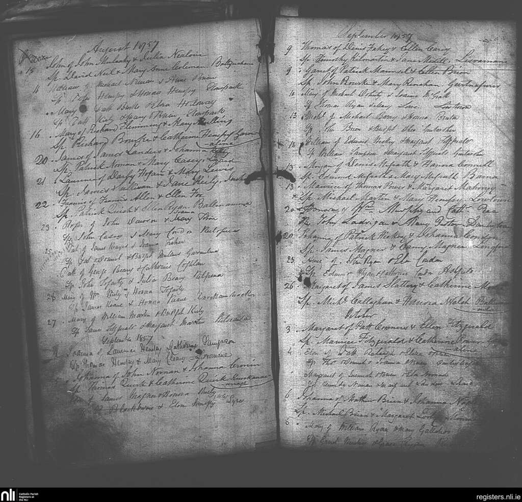 Galbally and Aherlow; County of Limerick, Tipperary; Diocese of Cashel and Emly. Baptisms, Aug. 1857 to Oct. 1857