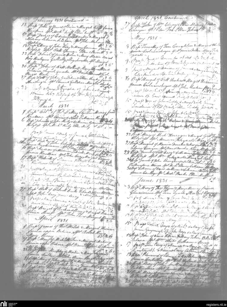 Kilbehenny; County of Limerick; Diocese of Cashel and Emly. Baptisms, Feb. 1831 to June 1831