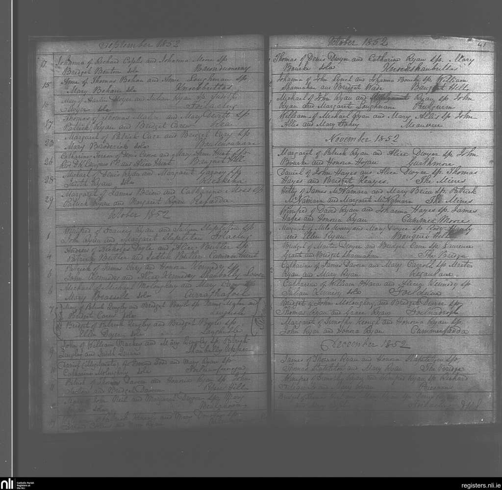 Kilcommon; County of Tipperary; Diocese of Cashel and Emly. Baptisms, Sep. 1852 to Dec. 1852